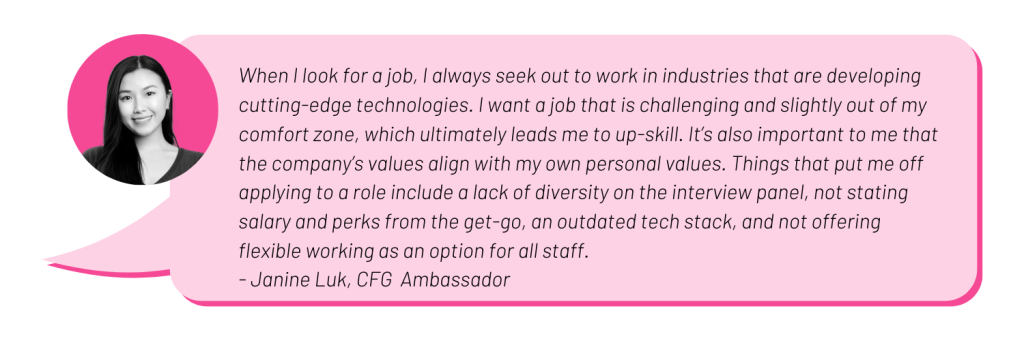 81% of our career switchers indicated that they would have stayed in their roles if given the opportunity to upskill. Career progression and professional development opportunities are what women want. By highlighting this on your job specs you not only set the tone for self-learning and improvement on the job but likely attract more women to apply too.